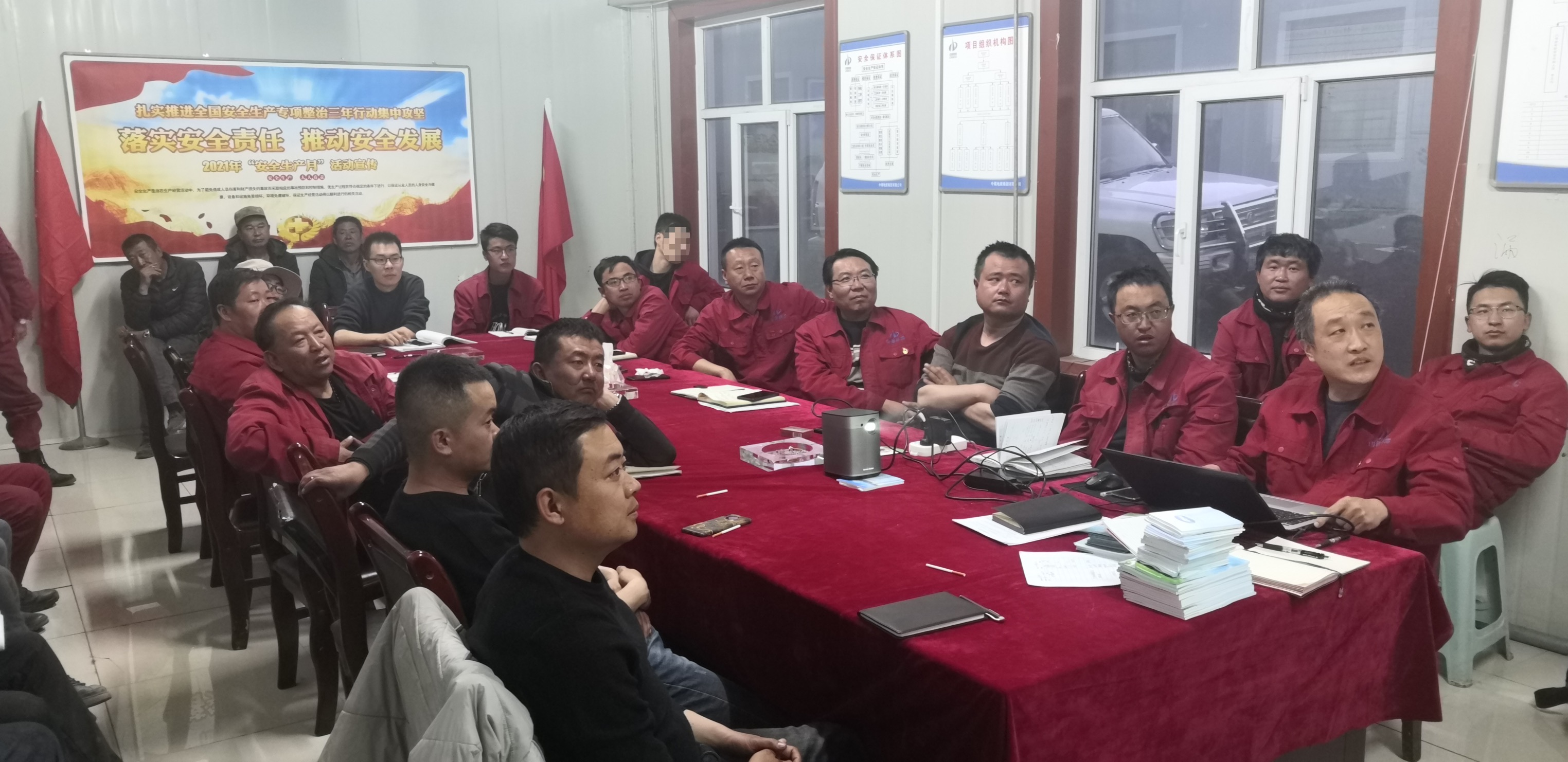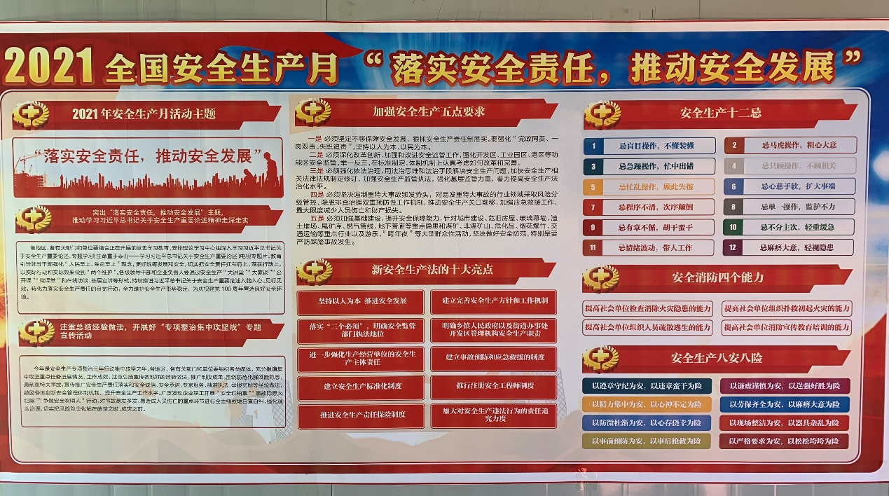 系列活动由地质集团杨辉主持,内容包括在项目部墙体悬挂2021年全国“安全生产月”主题横幅,张贴“安全生产月”标牌,开展“交通安全知识培训”课,颁发“禁酒令”,检查施工工地安全环保工作等。通过这些举措,使项目部工作人员、劳务队人员及来往人员强化安全意识,规范安全规程。