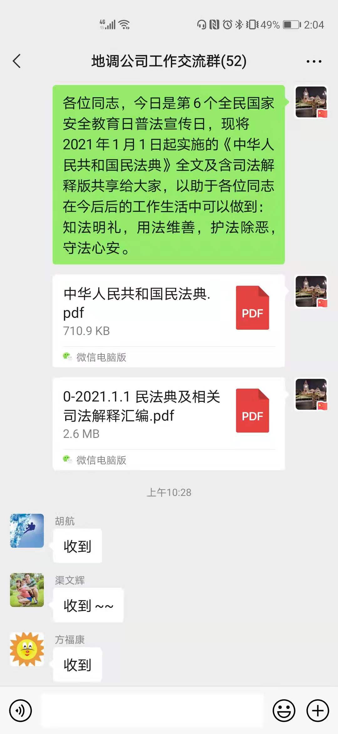 在活动文件下发之后,地调公司第一时间在公司工作群中下发了相关文件,开展普法知识竞赛活动,并将民法典及相关司法解释同时发给大家,希望可以将相关法律知识与本次普法活动所讲述的国家安全教育知识相结合,运用到工作生活中去,通过法律知识为员工的生活保驾护航。