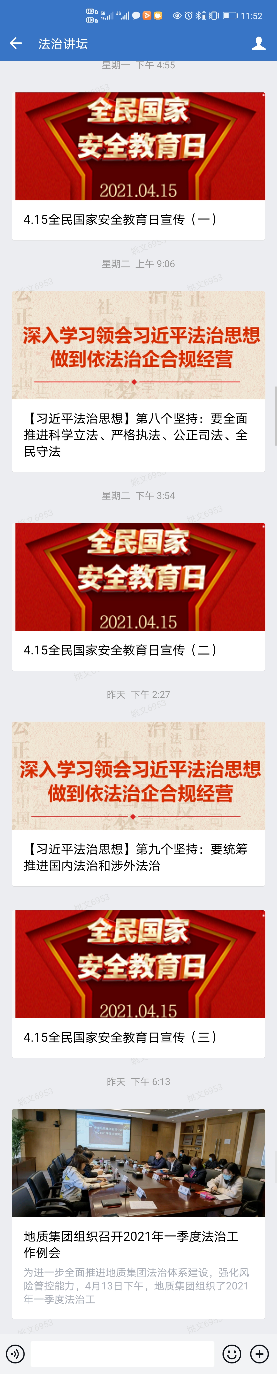 地质集团在一季度法治例会上,以“全面践行总体国家安全观”为题进行了全民国家安全教育知识宣讲,并发放普法宣传册,定制普法宣传物,制作H5页面,在办公楼内设置宣传展板,在集团自媒体平台进行普法知识连载,组织国家安全教育网络答题活动等方式,对全民国家安全教育日进行宣贯。