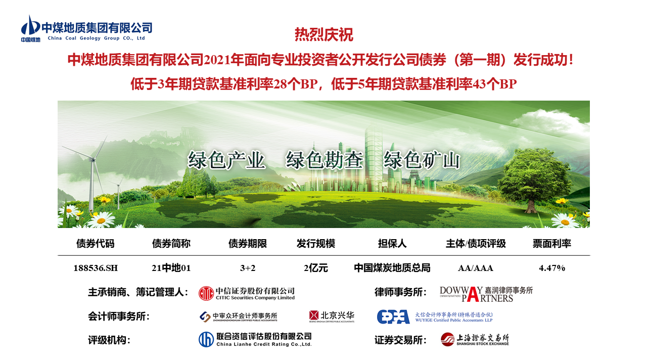 8月16日,中煤地质集团有限公司2021年面向专业投资者公开发行公司债券(第一期)成功发行。本期债券简称21中地01,债券代码188536.SH,主体评级AA,债项评级AAA,债券期限为3+2年期,发行规模2亿元,发行利率4.47%,由中国煤炭地质总局提供全额无条件不可撤销连带责任保证担保,中信证券作为主承销商和簿记管理人。本期债券募集资金用于补充公司流动资金。